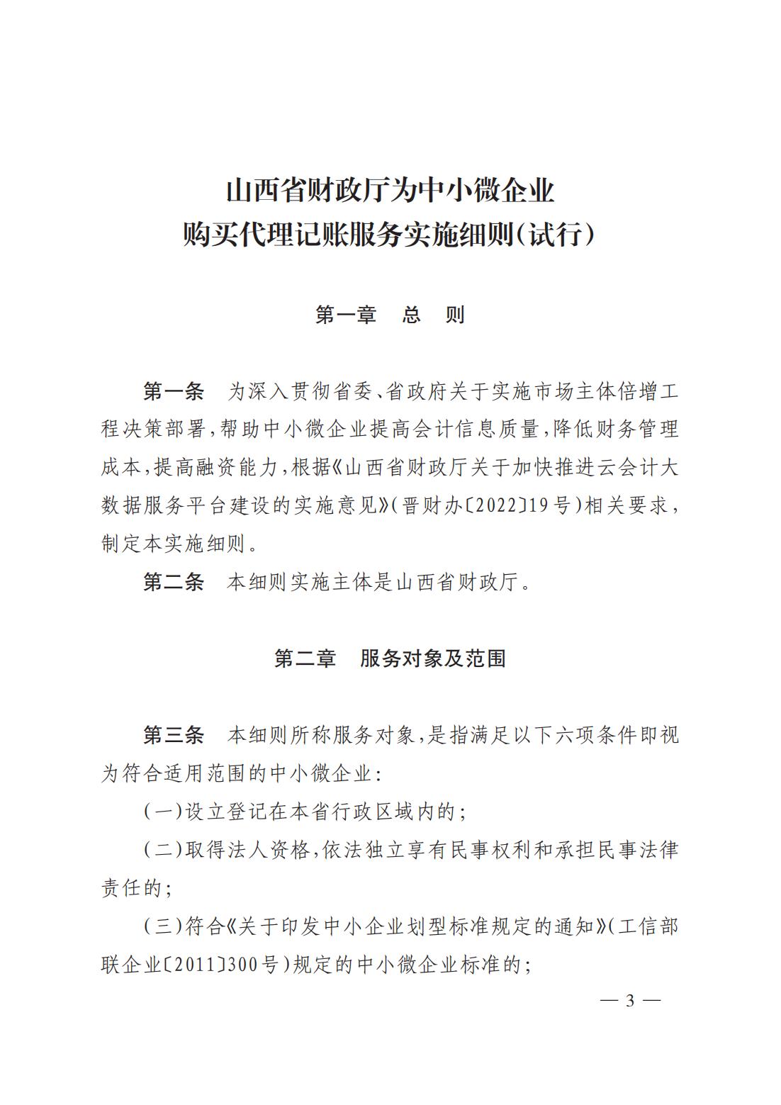 為進(jìn)一步支持全省中小微企業(yè)持續(xù)快速健康發(fā)展,切實(shí)加強(qiáng)和改進(jìn)會(huì)計(jì)服務(wù)能力,根據(jù)《山西省人民政府辦公廳關(guān)于印發(fā)強(qiáng)化市場主體倍增要素服務(wù)保障若干措施(試行)的通知》(晉政辦發(fā)〔2022〕7 號(hào))、《山西省財(cái)政廳關(guān)于加快推進(jìn)云會(huì)計(jì)大數(shù)據(jù)服務(wù)平臺(tái)建設(shè)的實(shí)施意見》(晉財(cái)辦〔2022〕19 號(hào))文件要求,省財(cái)政廳研究制定了《山西省財(cái)政廳為中小微企業(yè)購買代理記賬服務(wù)實(shí)施細(xì)則(試行)》,現(xiàn)予以印發(fā),請(qǐng)結(jié)合工作實(shí)際,認(rèn)真抓好貫徹落實(shí)。